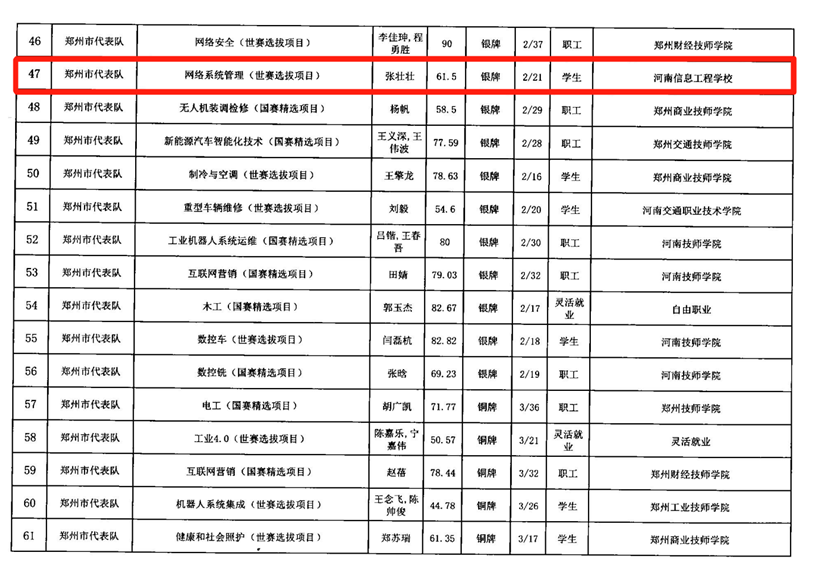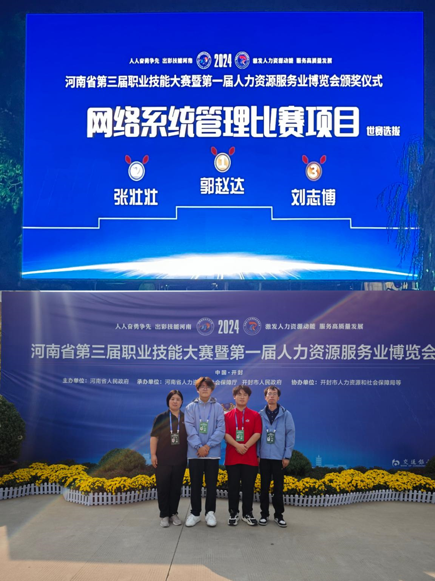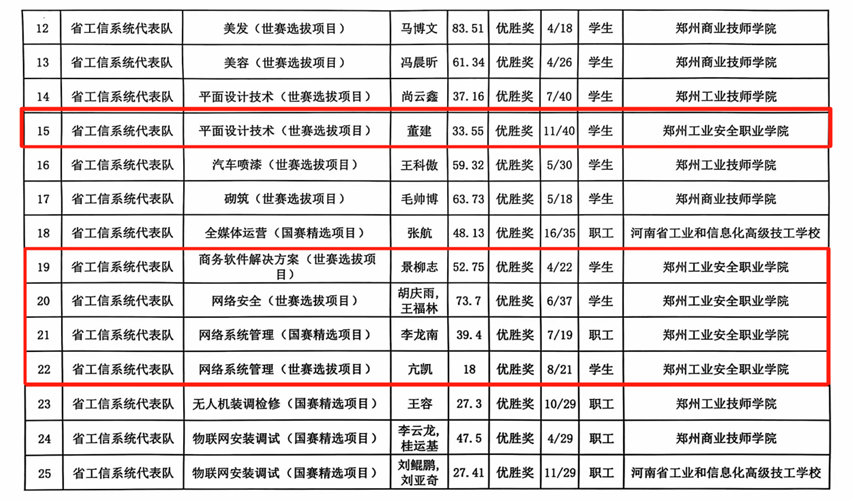 中专部计算机技术系选手张壮壮荣获网络系统管理(世赛选拔)赛项银牌。高职部软件技术系选手亢凯荣获网络系统管理(世赛选拔)赛项优胜奖,景柳志荣获商务软件解决方案(世赛选拔)赛项优胜奖,胡庆雨、王福林荣获网络安全(世赛选拔)赛项优胜奖。