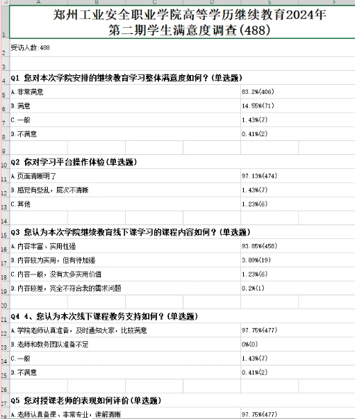 课后,我校组织广大学生对课程难度和教学总体安排满意度情况进行调查,本次参加调查学生488人,总体满意度在97%。