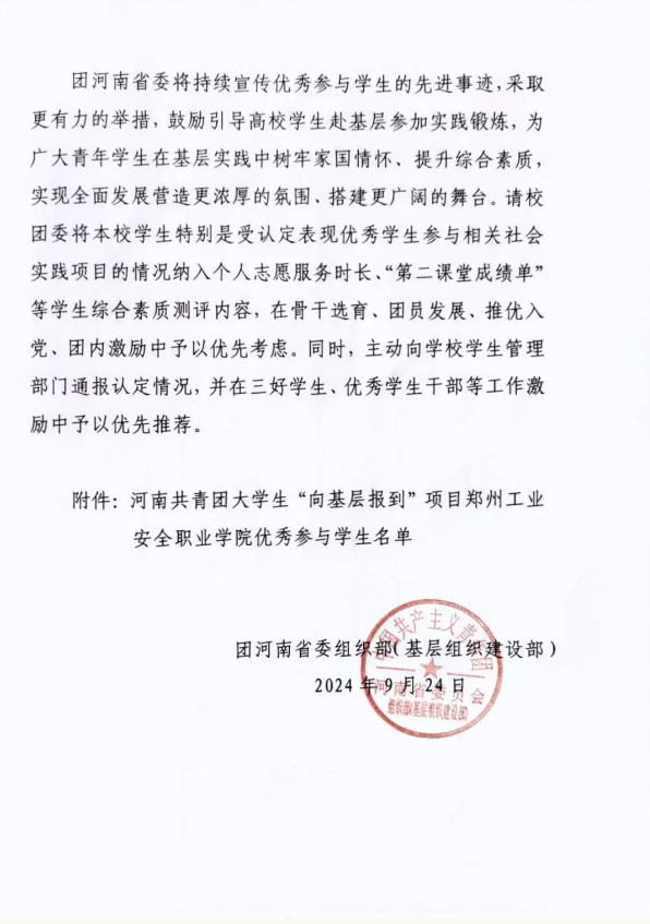 近日,共青团河南省委员会印发《关于认定2024年度河南共青团大学生“向基层报到”优秀参与学生的函》,2024年暑假期间,我校学生积极参加“向基层报到”等相关社会实践项目,在基层社会治理、乡村振兴、绿色发展等领域中勇于担当,甘于奉献,展现了新时代大学生良好的精神风貌,受到了团省委的肯定,我校信息工程系网络技术 23-1班冷函哲同学被团省委认定为“优秀参与学生”。