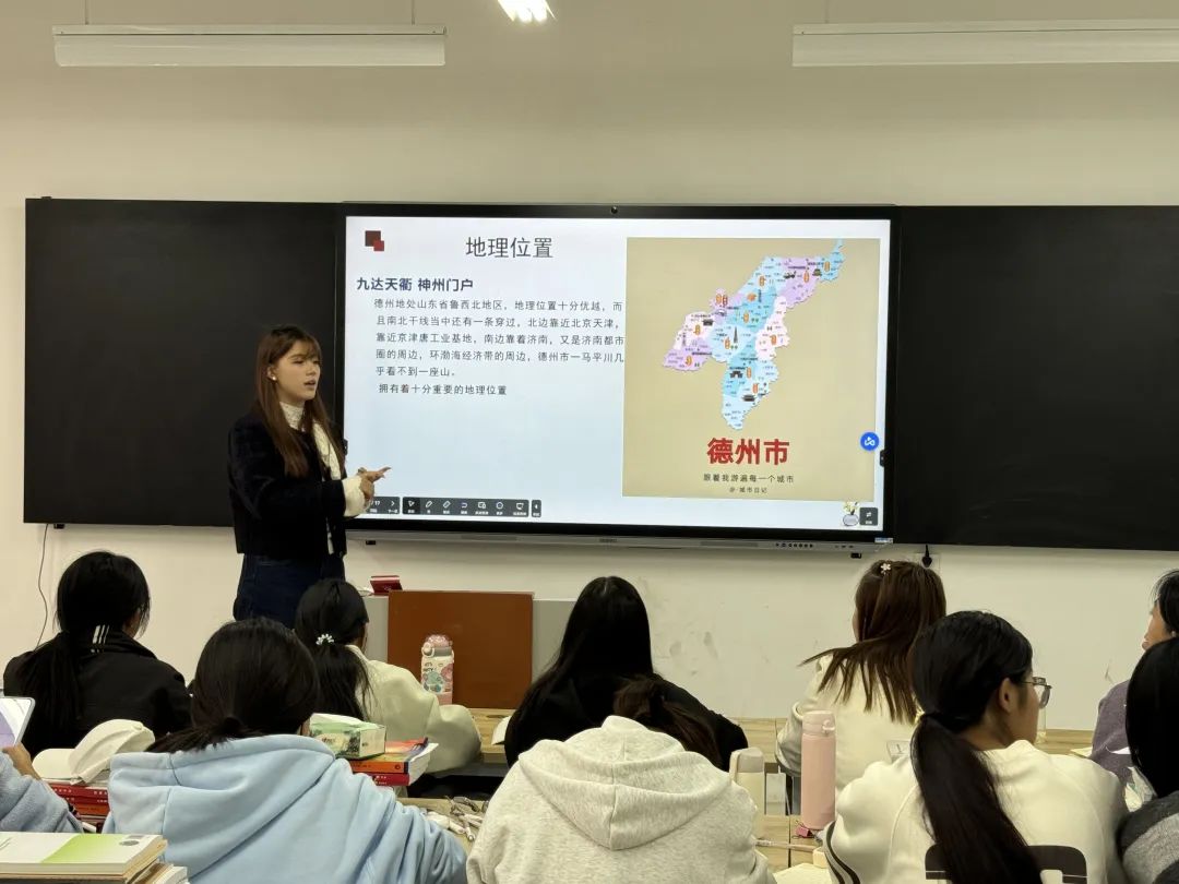 来自电子商务班级的马梦晗同学分享了她的家乡——郑州市登封市。登封市位于河南省中西部,中岳嵩山南麓,不仅历史悠久,是少林武术的发源地,也是夏朝的都城之一。她生动地描绘了嵩山、少林寺、嵩阳书院等著名景点,以及“天地之中”历史建筑群这一世界文化遗产,学生们都对登封充满了向往。