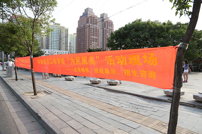 活动现场,悬挂着“职业教育支撑中国制造 成就出彩人生”、“河南信息工程学校为民服务活动现场”的宣传条幅,摆放着介绍职业教育活动周和河南信息工程学校的宣传展板,积极烘托活动氛围。
