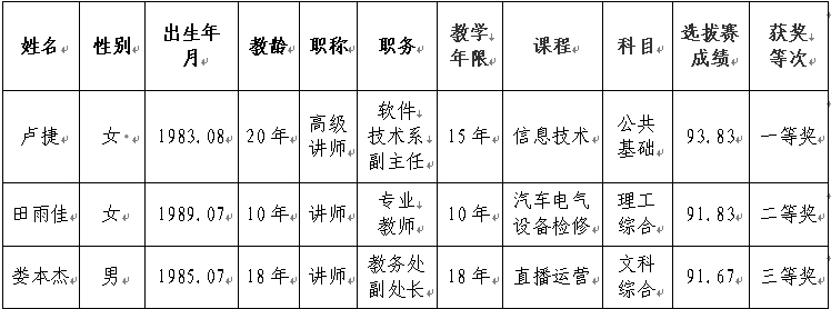 根据河南省总工会、河南省教育厅印发的《关于在全省教育系统举办2025年度教学技能竞赛的通知》(豫工文 〔2025〕41号)的文件要求,我校7月11日在金水校区开展河南省教育系统教学技能竞赛选拔赛,本次比赛共有9名选手参赛。由3名专家评委现场打分、技能竞赛办公室认真审核,拟推荐以下3名选手参加2025年度河南省教育系统教学技能竞赛,结果如下: